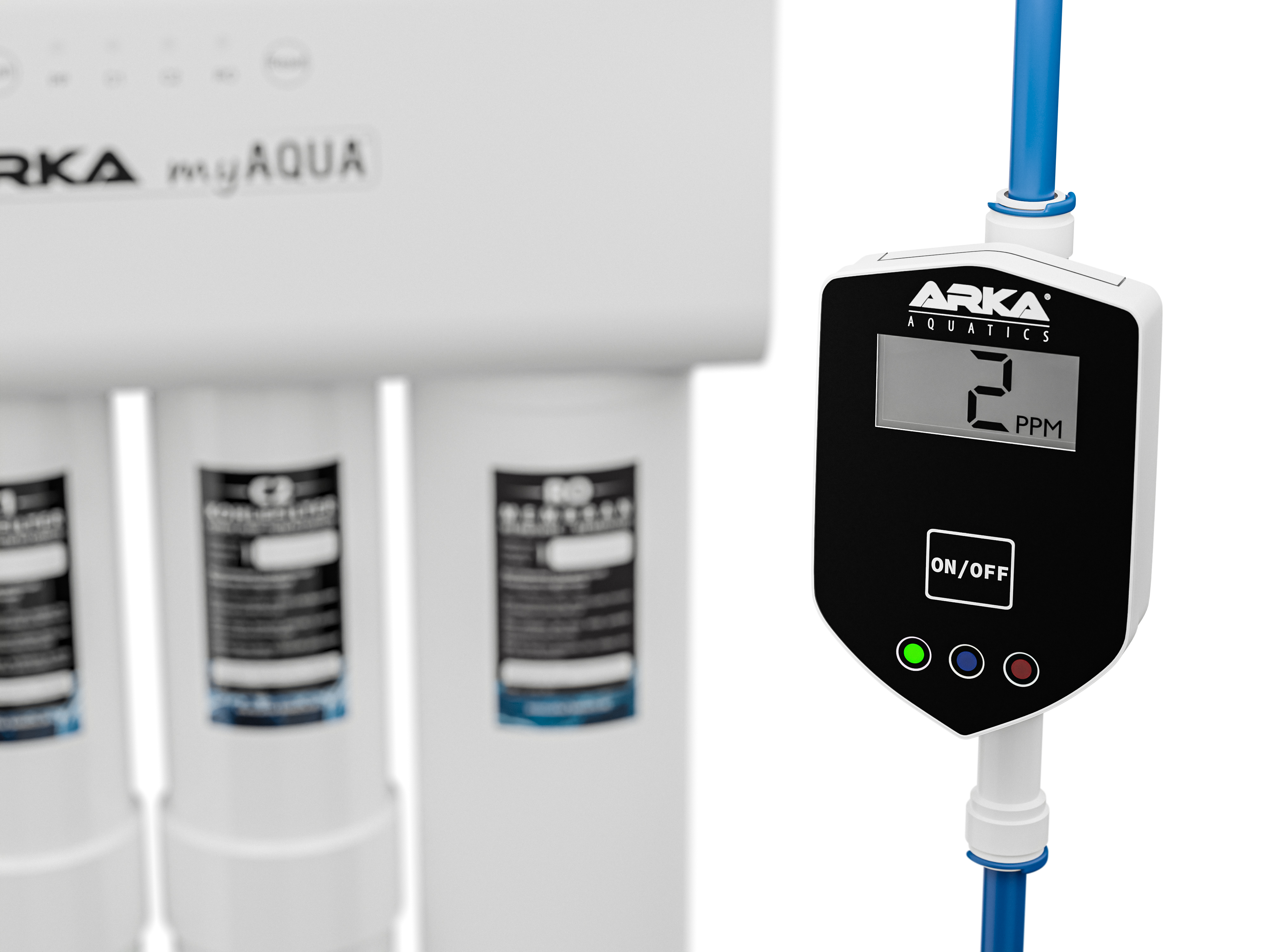Das ARKA Aquatics myAqua® Inline TDS-Messgerät misst dauerhaft und zuverlässig die Menge an TDS (gelösten Feststoffen) im Wasser. Es wird einfach mittels der mitgelieferten 1/4 Zoll Adapter an den Osmosewasserauslassschlauch der jeweiligen Umkehrosmoseanlage angeschlossen, eingeschaltet und schon können Sie den aktuellen TDS-Wert vom Display ablesen.