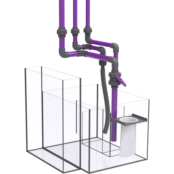 - Kammer 3: Hauptfilterkammer mit konstantem Wasserstand. Hier können Abschäumer sowie weitere Filter wie bspw. ein Medienreaktor (Nyos® TORQ®) eingebracht werden.